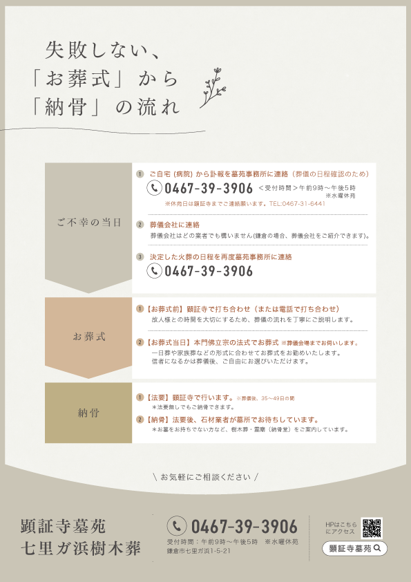 顕証寺ではご信者に限らず、墓苑・樹木葬利用者の方々のご相談をお受けしています。お気軽に下記までお申し込みいただき、お急ぎの場合は寺務所(0467-31-6441)までお電話願います。